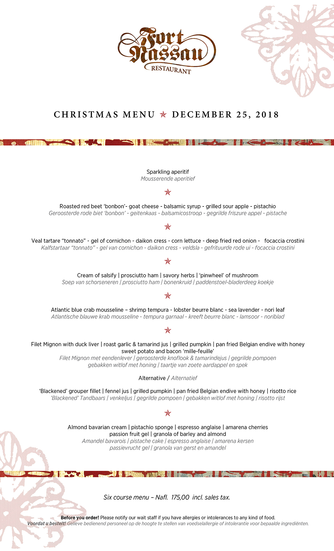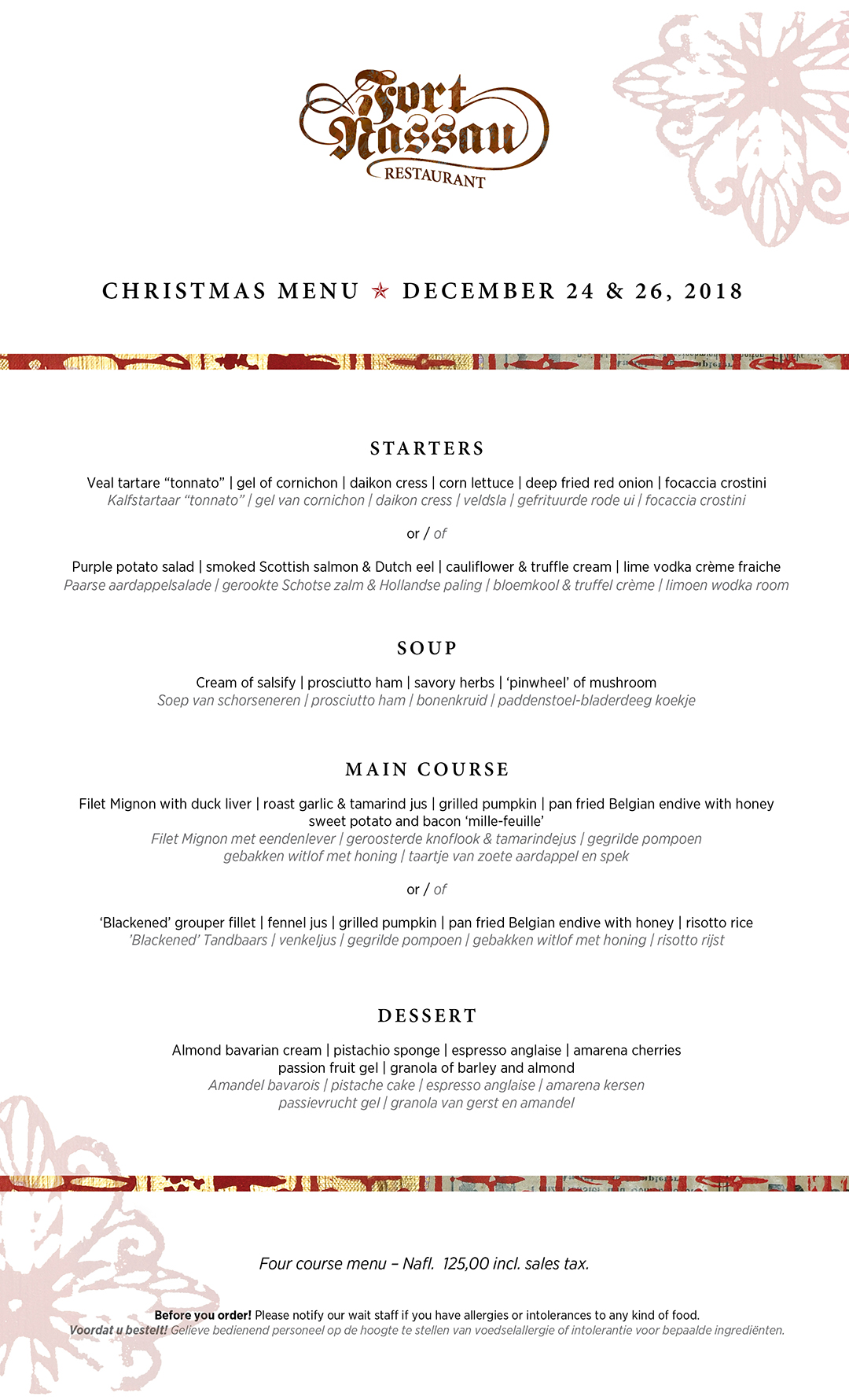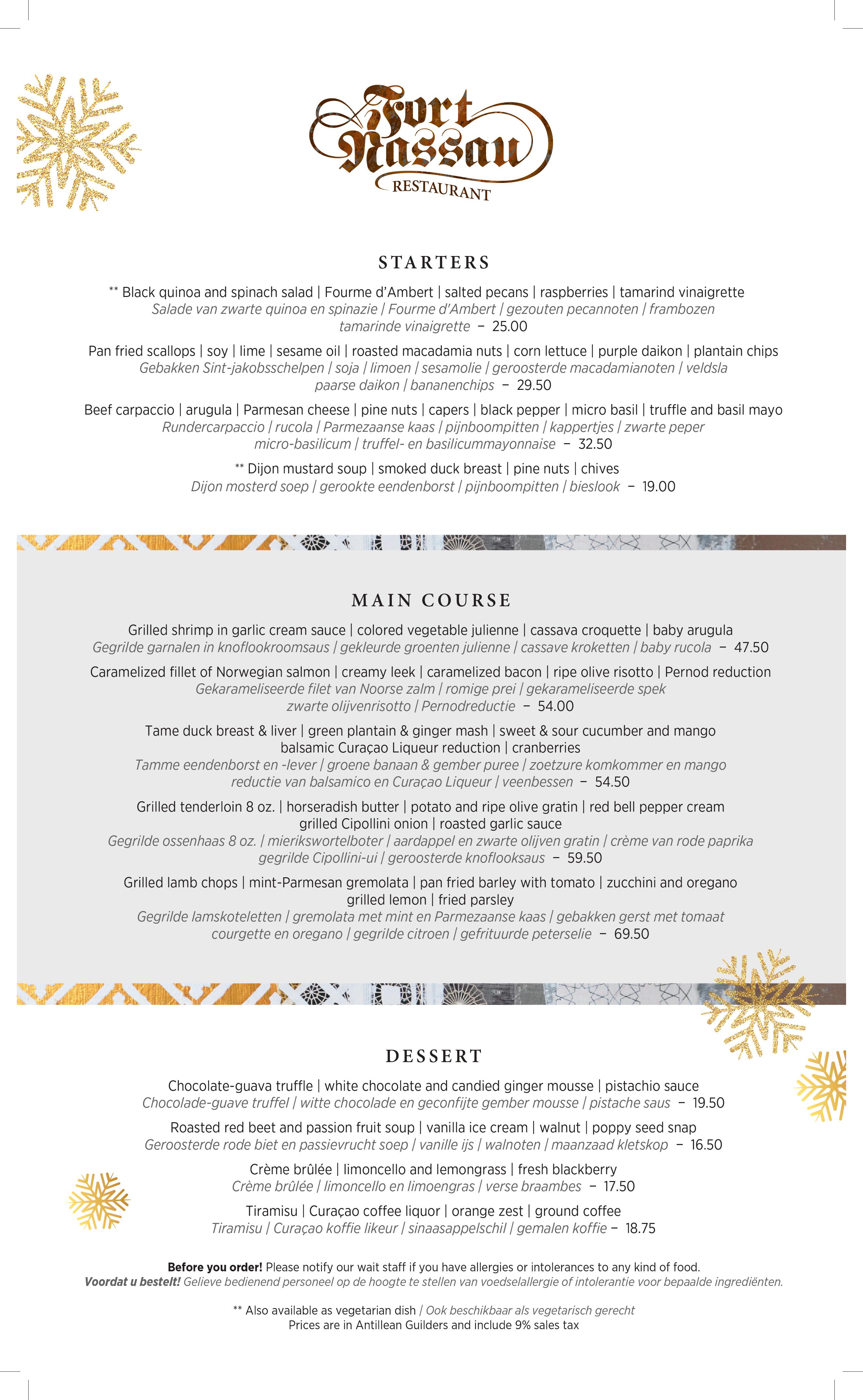 Kerstmis komt snel naderbij! Tijd om de kerstmenu’s te bekijken en uw tafeltje te reserveren voor een vrolijk kerstdiner met familie of vrienden! Dit jaar biedt Fort Nassau een viergangen keuzemenu op 24 en 26 december & een feestelijke a la carte kaart. Op 25 december (volgeboekt) een zesgangenmenu met een mousserende aperitief bij aankomst! Reserveer nu uw tafel via onze website reserveringspagina!